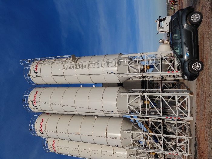 Four white, cylindrical silos with the "AMM" logo stand tall under a vibrant blue sky. A complex network of white steel supports surrounds the silo bases, revealing glimpses of yellow and blue machinery. Adjacent to the silos is a gray car parked horizontally on a brown surface, with a truck partially visible behind it. The scene captures an industrial setting with a vehicle positioned near the large storage structures.
