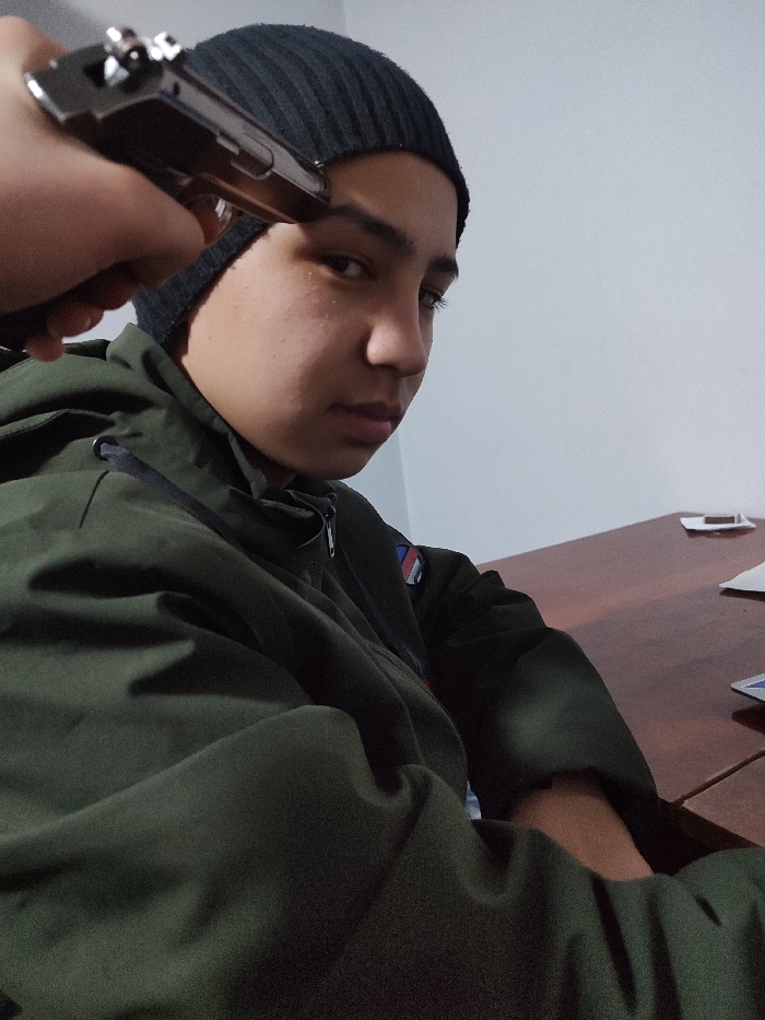- "A person in a dark green jacket and a black beanie is looking at the camera while someone holds a pistol to their forehead" by FM-8LV0q2, licensed under CC BY 4.0