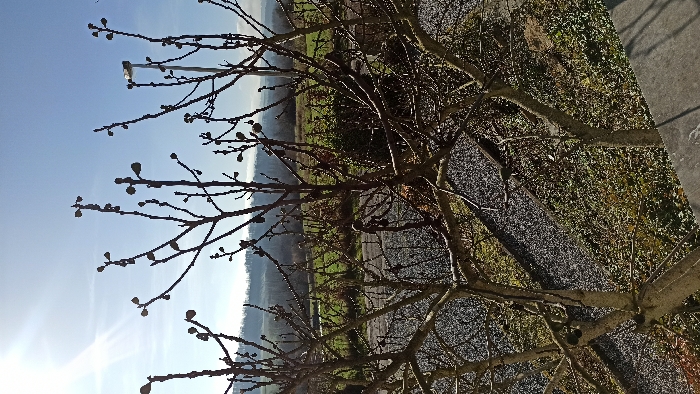 The image displays an outdoor, elevated perspective of a rural landscape in Florenville, Belgium, captured on a bright, clear day. In the immediate foreground, a multi-trunked deciduous tree with light brown-grey bark occupies the majority of the frame, its numerous bare branches extending upwards and outwards. Prominent, dark, ovoid buds are visible along the branches, along with several small, dark, round objects, possibly shriveled fruits or galls. The bottom right edge reveals a grey, textured concrete or stone surface, likely a railing or wall. Below the tree, the ground is covered with sparse, dry vegetation and denser, dark green shrubs. A dark-toned path or narrow road, possibly gravel or asphalt, runs horizontally through the midground, partially obscured by the foreground tree's lower branches. Beyond this path, expansive green fields or meadows extend towards a series of rolling hills in the background. These hills are predominantly covered with dense, bare deciduous trees, suggesting a forested area. The sky above is clear and bright blue, with a distinct sun flare originating from the upper left quadrant. A tall, slender grey lamppost is visible on the right side of the frame, its top section extending above the horizon line. No individuals, animals, or explicit actions are discernible within the scene.