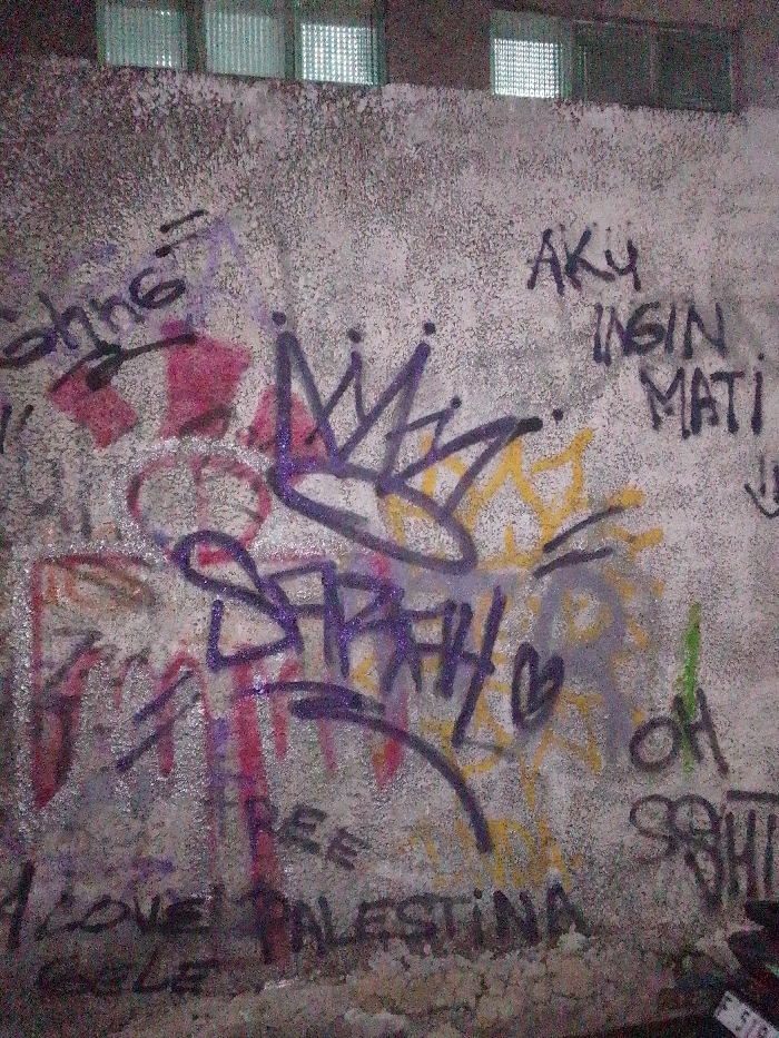 A concrete wall in Bogor, Indonesia, is depicted, heavily marked with various graffiti in multiple colors, including black, purple, red, yellow, and green. The wall surface is textured and appears light grey under dim lighting. **Specific Graffiti Details:** * **Upper Left:** The word "shine" is written in black. A red peace symbol is visible below it. * **Upper Right:** The phrase "AKU INGIN MATI" (Indonesian for "I want to die") is written in black. A black arrow points downwards to its right. * **Center:** A large, purple outlined crown symbol is prominent. Below it, the name "SPAHH" is written in purple, with a small purple heart symbol to its right. * **Mid-right:** Yellow starburst-like shapes are present. * **Lower Left:** The phrase "I LOVE PALESTINA" is written in black. * **Lower Center:** The words "FREE PALESTINA" are written in black. * **Lower Right:** The letters "OH" are written in black. A partial, illegible black tag is also visible. **Environmental Details:** * **Above the Wall:** A dark structure is visible, featuring three distinct rectangular openings, each fitted with grid-patterned glass blocks or vents. * **Below the Wall:** The ground is dark and uneven. A portion of a dark object, possibly a vehicle component like a tire or fender, is partially visible at the bottom right, with a fragment of a white license plate displaying "F 518". The scene appears to be under low-light conditions, contributing to the image's grainy quality. No people are visible.