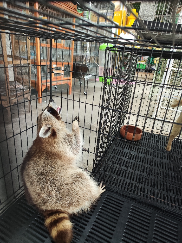 - "A raccoon (Procyon lotor) is contained within a black wire mesh cage with a black slatted plastic floor, situated in an animal retail or shelter environment in Kathu, Thailand" by FM-EW4RH2, licensed under CC BY 4.0