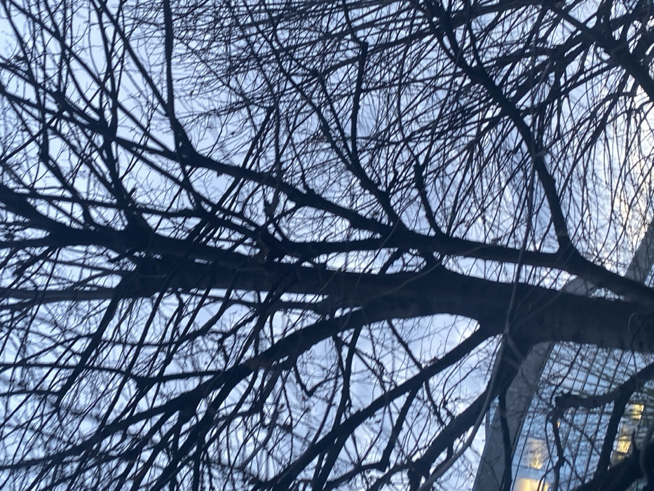 A dense network of bare tree branches dominates the scene against a pale blue-gray sky