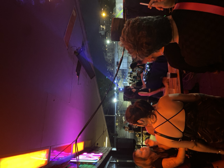 At a dimly lit outdoor gathering, a group of people stand close to each other. A person holding a cigarette is visible in the upper right corner. A beam of blue light points toward a crowd in the background. Fluorescent lights shine from beneath a ledge in the lower left. The composition is vertically oriented and has a slightly off-kilter perspective.