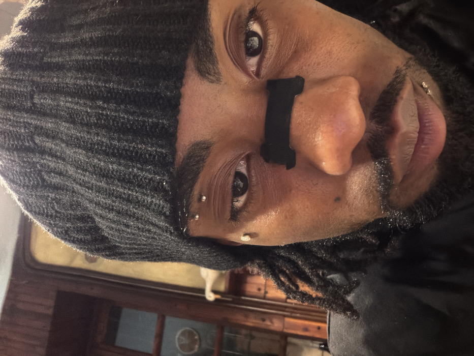 A person wearing a gray knit cap is seen in a close-up selfie. The individual has dark skin, dark eyes, and dreadlocks. A black, rectangular object is adhered to their nose. They have facial piercings near their eyebrows and on their left cheek. The bottom half of the picture shows a glimpse of a wooden surface and a window with a circular design. The overall image is slightly rotated.
