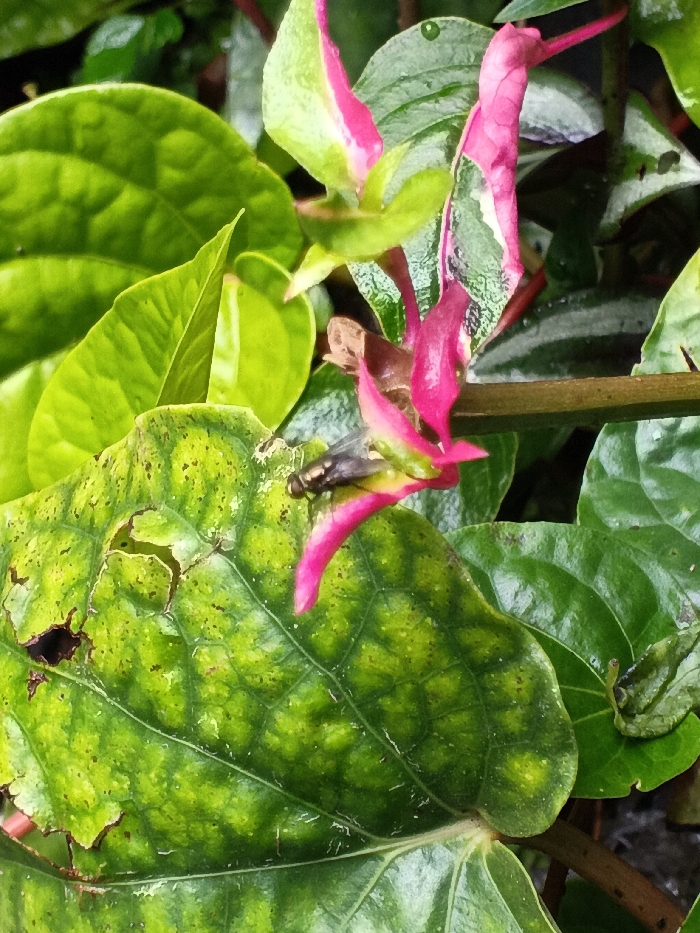 A vibrant close-up displays diverse plant life. Lush green leaves, some with speckled patterns, dominate the view. Bright pink, tubular flowers add a striking contrast. A small fly rests upon one of the leaves, and a tiny snail clings to another. A section of the leaf has been eaten, revealing its texture.