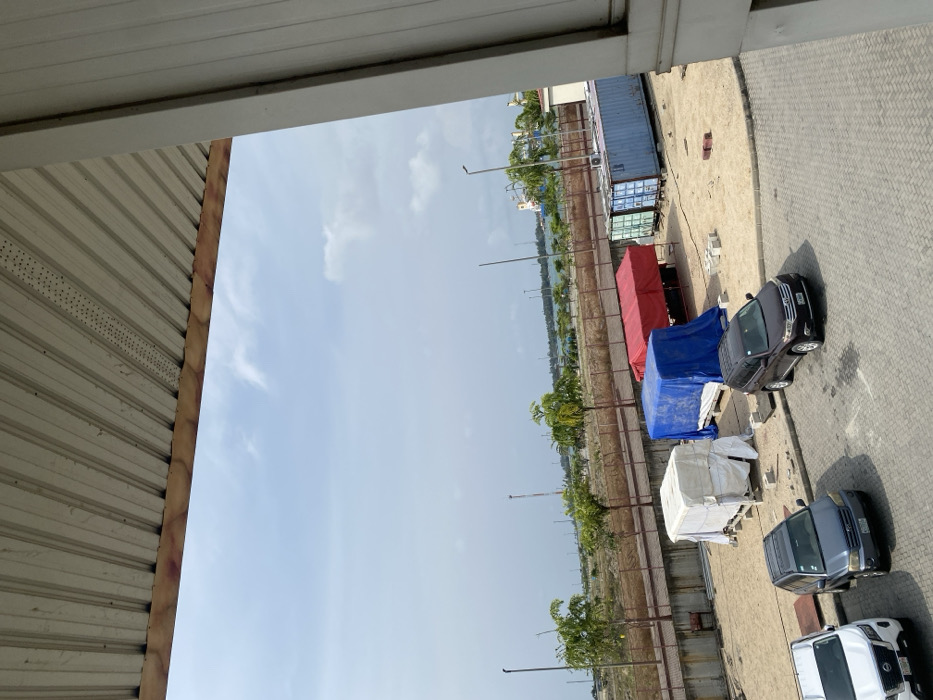 The image displays an outdoor scene in Inupa Kekere, Nigeria, observed from a slightly elevated perspective. The upper and right edges are framed by a light-colored corrugated metal roof structure and a vertical white building column. In the immediate foreground, a paved area with grey interlocking pavers features three parked SUVs: a white Nissan, a dark grey Toyota Highlander, and a dark brown Toyota Highlander. Adjacent to the paved section is an unpaved, sandy lot containing three large, rectangular objects covered by tarpaulins (one white, one blue, one red) and several scattered concrete blocks. Further right in the lot are two light blue and one green shipping containers. A low wall and a fence demarcate a dirt path beyond the sandy lot, lined with young palm trees and other broad-leafed trees. In the background, an expansive undeveloped sandy landmass transitions into a large body of water, likely a coastal area or lagoon, under a partly cloudy sky. Distant industrial structures or port equipment, including a prominent crane, are discernible along the far shoreline. No individuals are present in the scene.