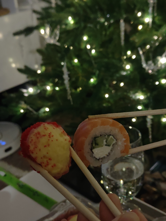 - "Two pieces of sushi are held in chopsticks, against the background of an illuminated Christmas tree" by FM-o6dT83, licensed under CC BY 4.0