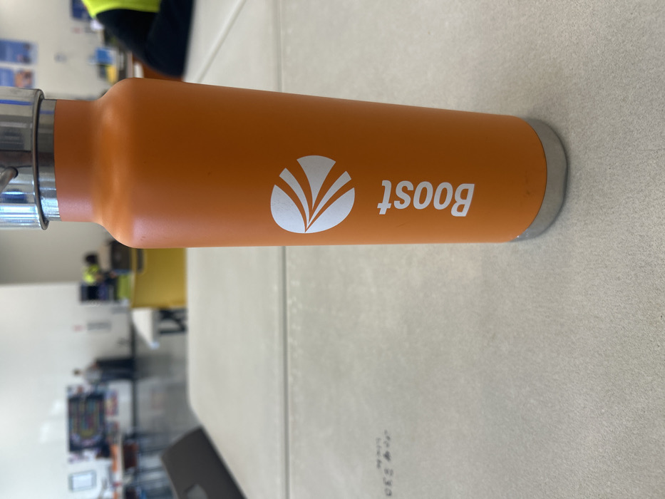 An orange water bottle with a stainless steel lid and base sits horizontally on a light-colored surface. The logo for Boost is visible, consisting of a stylized leaf design and the word "Boost" printed in white lettering. The background shows a blurred indoor setting, possibly an office or workspace, with desks, chairs, and people. The bottle is the primary focus of the image.