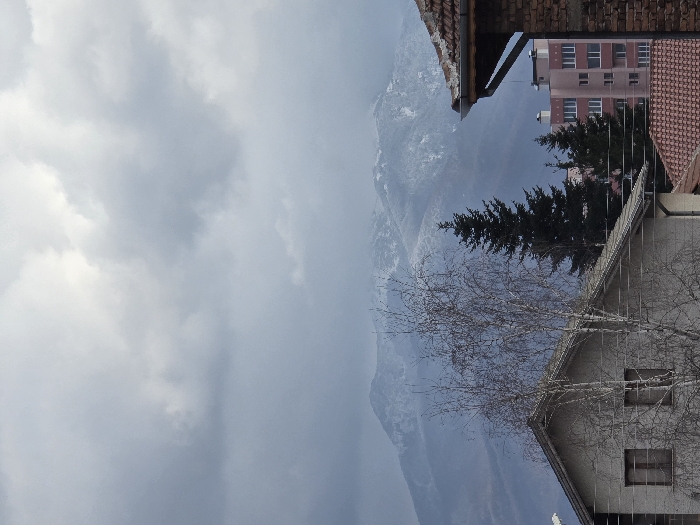 An elevated, static long shot captures a panoramic view of Berkovitsa, Bulgaria, under an overcast sky. The sky occupies the upper half, dominated by dense, grey stratocumulus clouds with brighter patches indicating variations in thickness. In the middle ground, a snow-capped mountain range extends horizontally across the frame, appearing hazy with a blue-grey tint. The immediate foreground and midground consist of urban elements. On the left, the upper portion of a light-grey, stucco house with two dark-framed rectangular windows and a dark-eaved roof is visible. In front of this house stands a leafless deciduous tree with fine, bare branches, likely in winter dormancy. To its right, a prominent dark green conifer stands tall, with other conifers scattered further back. Towards the right, a section of a brick building with a terracotta-tiled roof and dark gutter system frames the scene. Behind the trees and foreground structures, a multi-story residential building with a pinkish-brown facade and multiple white-framed windows is partially visible. Horizontal utility lines traverse the midground, passing over the light-grey house. No individuals or specific actions are depicted. The scene conveys a cold, possibly wintry, urban landscape against a mountainous backdrop.