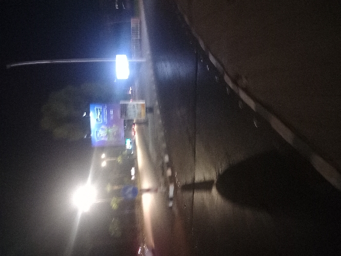 The image depicts a nighttime urban street scene within Al-Mazza Municipality, Syria. The perspective is from a paved area, possibly a sidewalk or roadside, looking down a multi-lane asphalt road. In the foreground, a prominent, dark, human-shaped shadow is cast on the lower-left portion of the road surface. The asphalt shows cracks, and a solid white line defines the edge of the road on the right, bordered by a curb. Several raised, reflective road markers are visible on the asphalt. The midground features a brightly lit roadway with multiple artificial light sources. A large, intense streetlight is positioned on the left. To its right, a blue circular traffic sign is mounted on a pole. Centrally located, a large, illuminated billboard displays a purple and blue advertisement, with a smaller rectangular sign positioned beneath it. Further down the road, multiple vehicles are visible by their headlights and taillights, indicating active traffic. Additional streetlights are visible further in the distance. In the background, a tall, slender pole structure stands to the right of the central billboard, adjacent to another brightly glowing rectangular light source or sign. Metal traffic barriers are visible on the right side of the road beyond this structure. Trees are silhouetted against the dark night sky. The overall lighting is provided by streetlights and illuminated signage, creating high contrast and deep shadows. No individuals are directly visible within the frame, but the foreground shadow indicates a human presence immediately adjacent to the camera's position.
