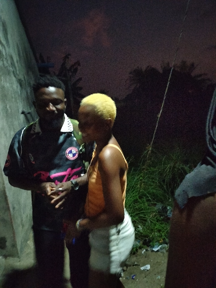 At dusk, a man and a woman stand outdoors. The man is on the left wearing a dark shirt with a design. The woman is next to him, wearing a light-colored tank top and white shorts, with blonde hair. Another individual is partially visible on the right side. Behind them are trees, bushes, and a dark sky with some clouds. The photo appears to have been taken in dim lighting.