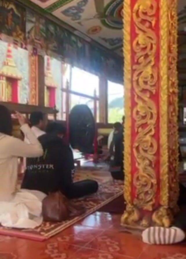 Inside a building resembling a temple, several people sit on a rug with a red patterned floor. One person in a black Monster Energy sweatshirt faces a large gong. A woman in white sits with her back to the camera. A man in a white shirt is also present. The building has ornate decorations, including a red and gold pillar with intricate carvings. Sunlight streams through the windows. The ceiling is decorated with colorful paintings. A small shrine-like structure is visible in the background.