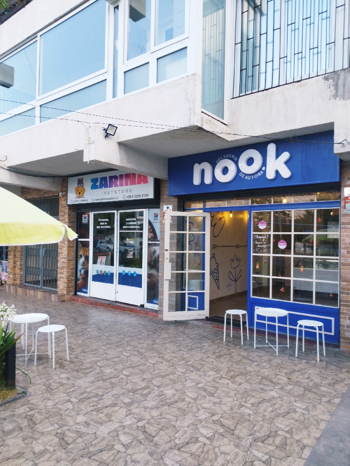 A building facade presents two storefronts. On the left, "ZARINA VETSTORE" is indicated by a sign above glass-paneled doors displaying pet products. Next door, "nook HELADERIA DE AUTORA" has a bright blue storefront with open glass doors. Inside, a drawing of an ice cream cone and flowers are visible on the wall. Several white stools stand outside both businesses, atop a paved area with a mosaic pattern.