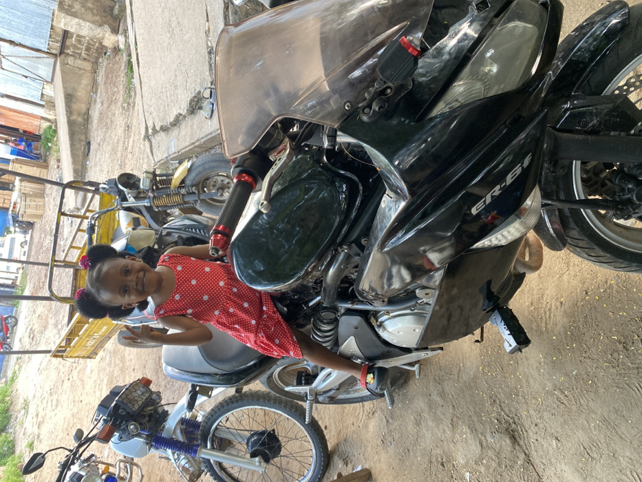 A young, dark-skinned child, appearing female, is seated on a black Kawasaki ER-6F sportbike in an outdoor urban setting in Lokoja, Nigeria