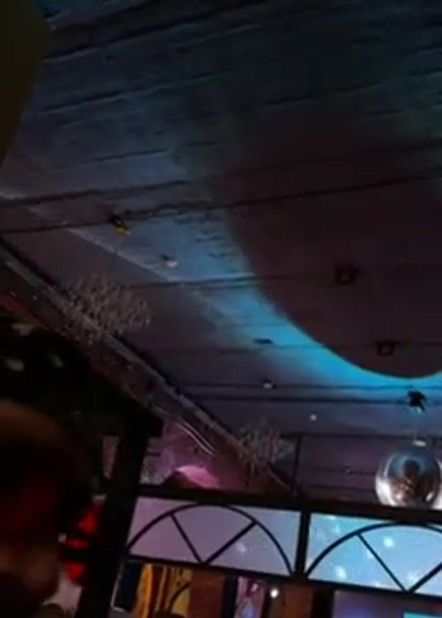 The camera pans up to reveal the ceiling of a large, crowded room with exposed brick walls and a textured, dark grey ceiling. There are hanging disco balls and what appear to be decorative light fixtures resembling miniature chandeliers. A blue spotlight creates a large, diffused circle on the ceiling. Below, the tops of people's heads are visible, indicating a crowd gathered for what appears to be an event. Geometric, arched structures are partially visible in the foreground, suggesting a stage or decorative element. A screen with a word beginning with "D" is visible at the back of the room. The overall atmosphere suggests a party or reception taking place in an industrial-chic setting.
