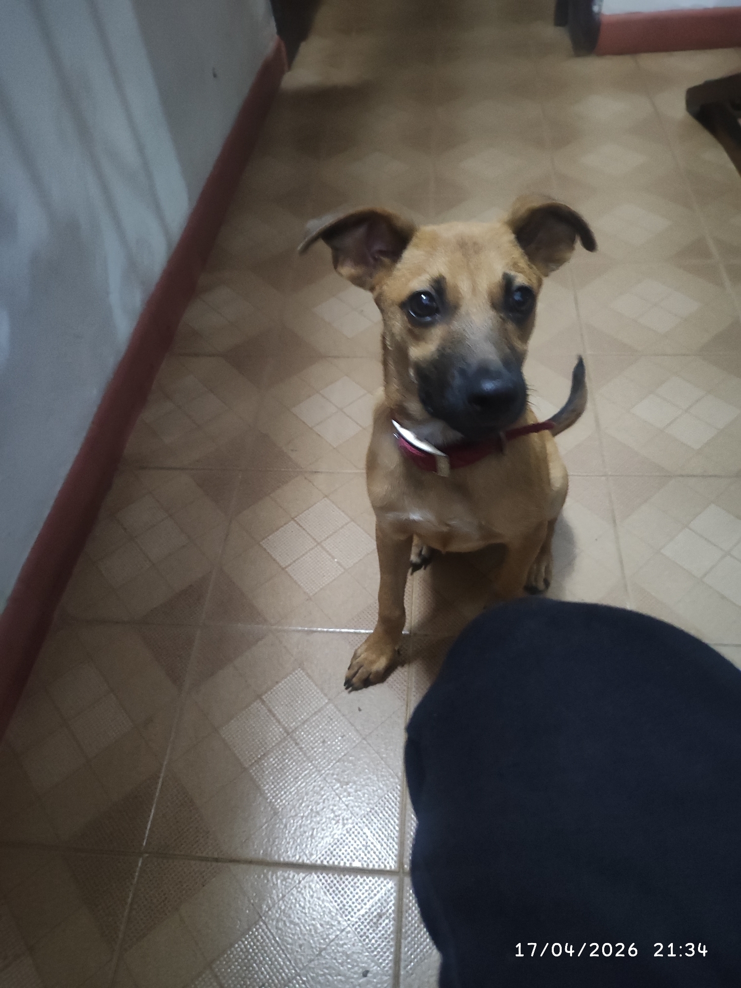 A medium-sized, tan-colored dog with a black muzzle, wearing a red collar, sits on a tiled floor. A person wearing dark clothing is positioned in the foreground, partially obscuring the lower right portion of the frame. The scene is indoors. The floor is covered in square tiles with a geometric pattern. Along the left edge of the frame, a white wall is visible, trimmed with a red border. The environment is domestic. The photo includes a timestamp "17/04/2026 21:34" in the bottom right corner. The specific location within the city of Tinaquillo, Venezuela cannot be determined from the image.