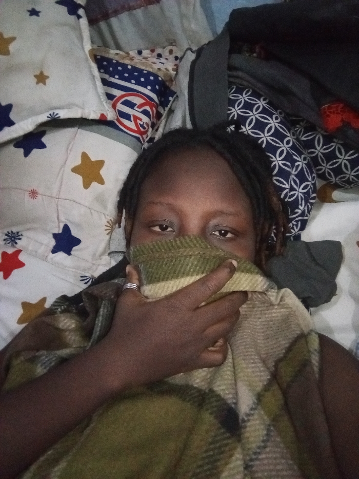 A person lies in bed, their face partially concealed by a plaid blanket. The individual has dark skin and dreadlocks. Their eyes are visible above the blanket. The bedding includes a star-patterned pillow, a blue-and-white pillow with a "G" design, and a blue patterned cloth. A gray garment is crumpled beside the pillows. The person's left hand, adorned with rings, holds the blanket against their face.