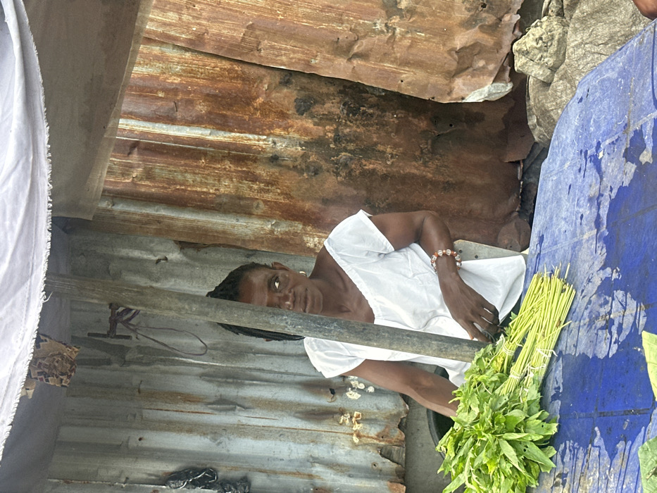 A woman wearing a white dress and beaded bracelet sits behind a table with bunches of green leafy vegetables. She leans on a pipe, her dark hair pulled back. The surrounding structure appears makeshift, with corrugated metal walls and a patched ceiling. Debris and hanging cloth add to the cluttered environment. The table is blue, with what looks like spills or stains on its surface.