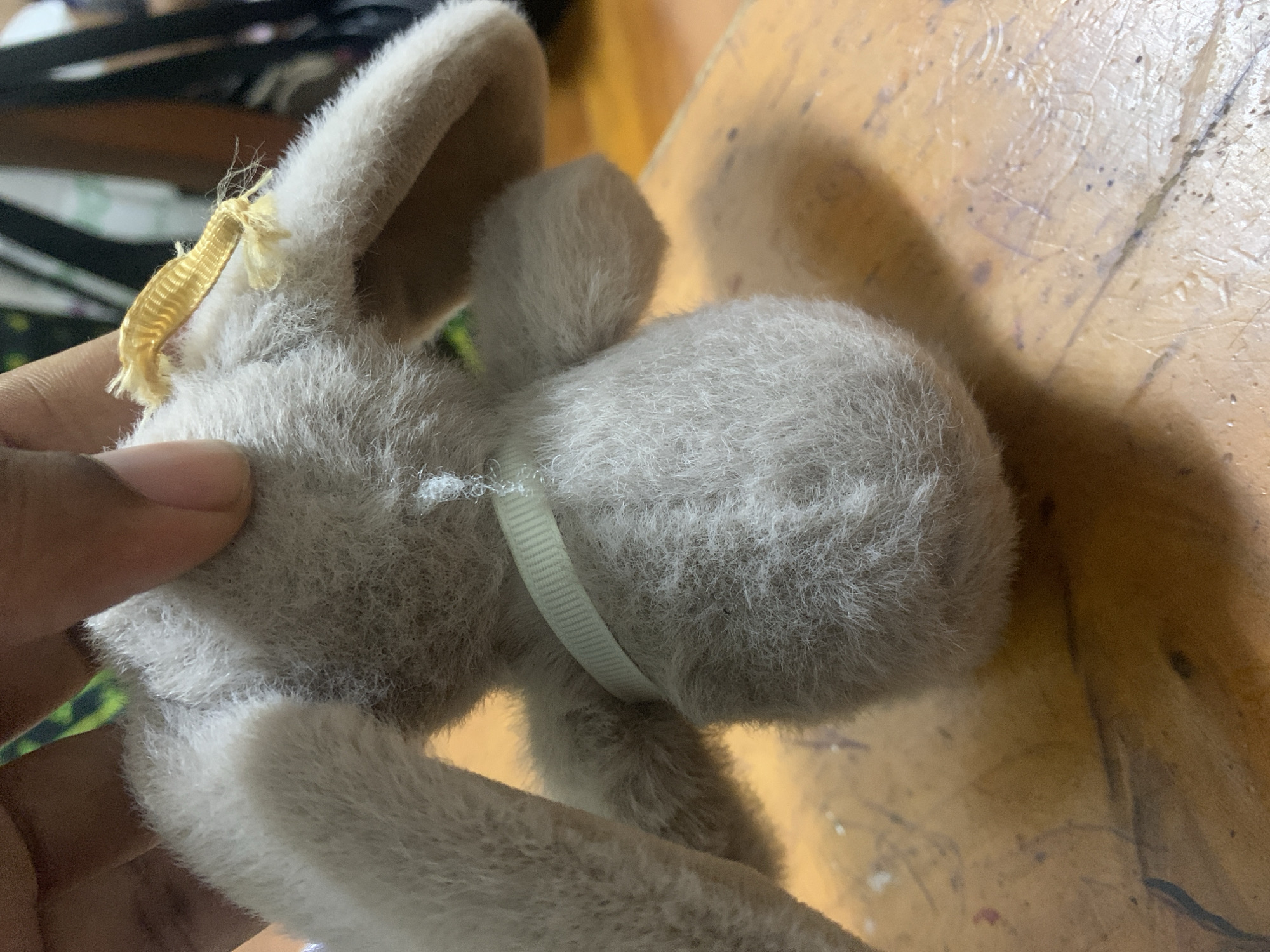 A close-up shot shows a hand holding a stuffed toy, possibly a kangaroo. The toy is light gray and fluffy, with an ear visible on the left side and a short tail at the top. A yellow ribbon adorns the ear. A light-colored ribbon is tied around the toy's neck. The background is blurred, with hints of a wooden surface and other objects. There is no information to suggest this photo was taken in Dar es-Salaam, Tanzania.