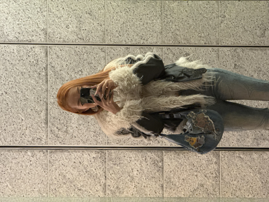A person with long, reddish-orange hair is seen from the waist up, capturing a mirror selfie with a dark-colored smartphone held directly in front of their face, obscuring features. They are wearing a dark jacket with extensive white or off-white shaggy faux fur trim on the collar, lapels, and cuffs, over a light-colored top. Light-wash blue jeans are also visible. A light blue denim hobo bag, featuring distressed fabric patches in shades of brown, yellow, and blue, hangs from the subject's left shoulder. The background is a wall constructed from large, light-grey speckled granite or stone panels, separated by distinct vertical seams. The precise location within Minato, Japan, cannot be determined from the visual information provided.