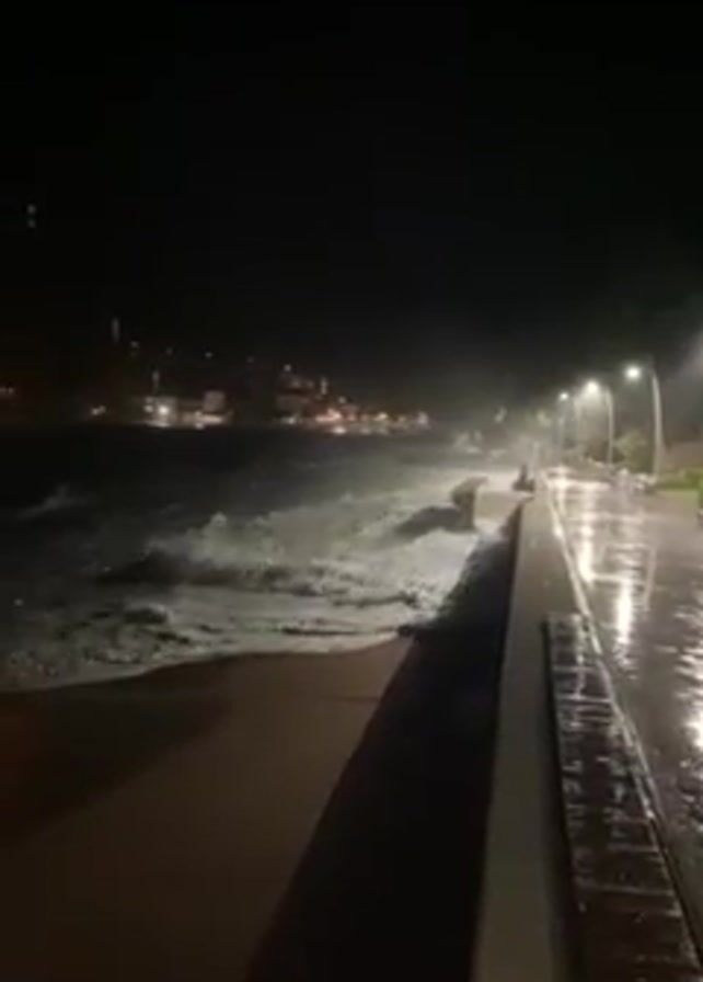nighttime beach scene. Large waves crash on the shore, illuminated by distant city lights. A wet, paved walkway runs alongside the beach, lit by streetlights. The scene appears to be filmed from a slightly elevated position along the walkway. There is no visible human presence.