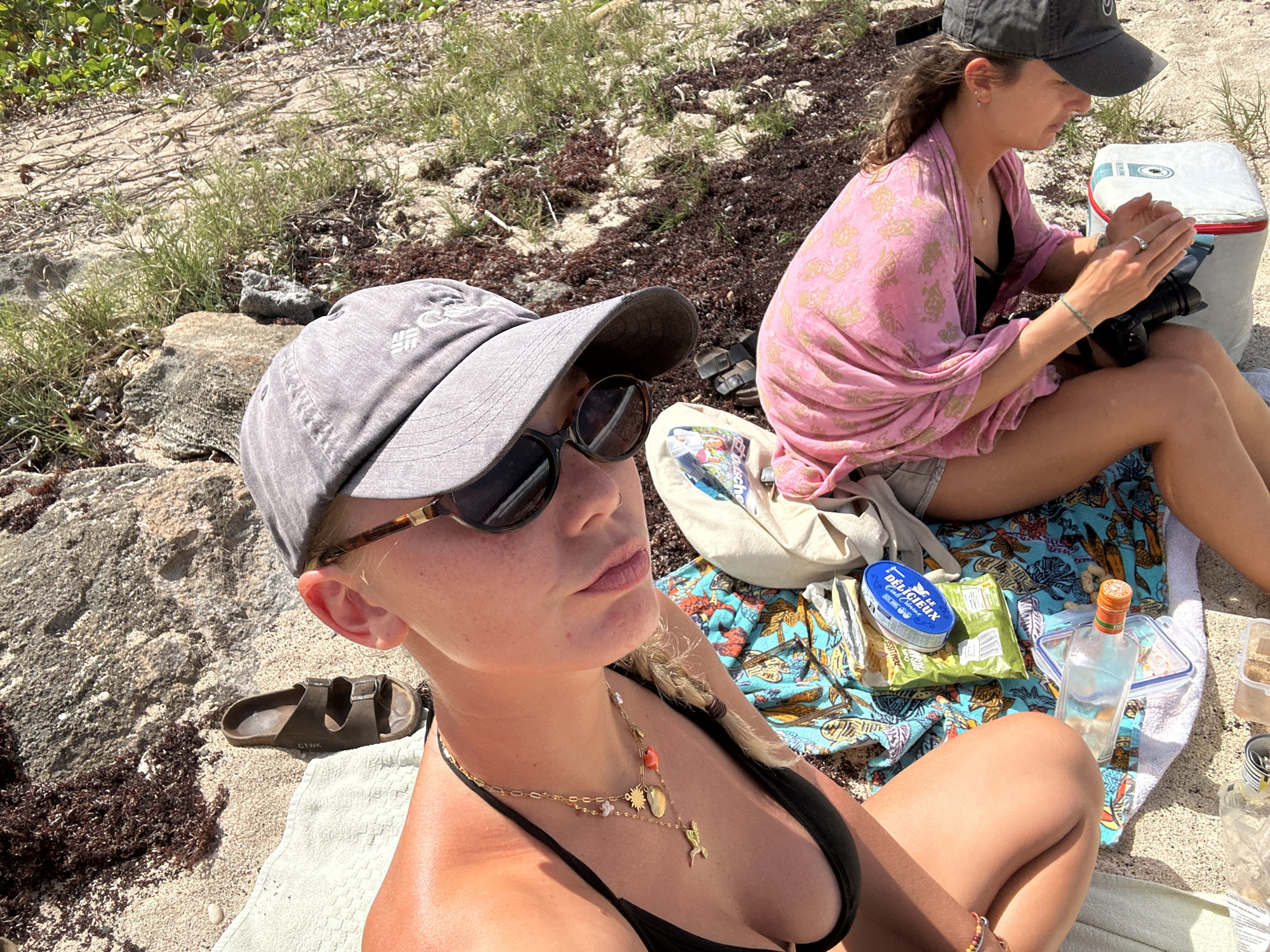 The image depicts two females engaged in leisure activities on a sunny beach in Le Moule, France. In the foreground, a female is positioned facing the camera, wearing a grey baseball cap, dark sunglasses, a black bikini top, and a layered gold necklace featuring multiple charms including a shell and a mermaid or fish tail. Her blonde hair is partially visible. She is seated on a light green towel. To her left, a single brown Birkenstock-style sandal, labeled "CTWK," rests on the sand. In the mid-ground, to the right and slightly behind the foreground individual, a second female is seated. She wears a dark grey baseball cap, a pink patterned wrap over a black bikini top, and light-colored shorts. She is looking downwards, actively handling a black camera or small electronic device. A white soft cooler with red trim is situated to her right. Between the two individuals, on a blue and orange patterned beach towel, are various items: an oval blue tin labeled "DELICIEUX," a green bag of snacks, a clear glass bottle with an orange and green label, and two clear plastic food containers. The environment consists of a sandy beach surface interspersed with light-colored rocks, patches of green vegetation, and significant accumulations of dark red-brown seaweed.