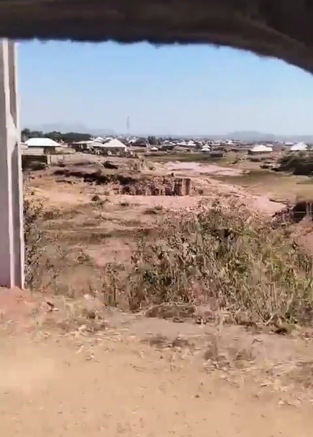 moving view from a vehicle, likely a tuk-tuk, traveling on a dirt road. The landscape is arid and rural, with dry grass and sparse vegetation. In the distance, there are modest buildings, suggesting a small village or settlement. The sky is clear and blue. The overall impression is of a dry, rural environment. There are no people visible in the video.