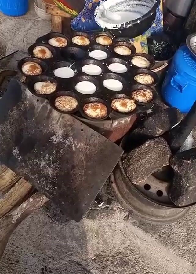 A person is cooking outdoors over a charcoal fire. The person is sitting on a stool wearing a red top and a colorful patterned skirt. They are pouring a white batter from a black bowl into a series of shallow circular depressions in a black metal pan sitting directly over the fire. Some of the depressions in the pan already contain partially cooked, browned cakes. The fire is contained within a car wheel with rocks around it, and a metal sheet is positioned to the side. A blue bucket and a blue cooler are visible in the background. The ground is concrete.
