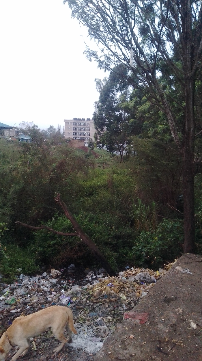 The image displays an outdoor scene in Nkaimurunya ward, Kenya, featuring a natural and urbanized environment under an overcast sky. In the lower-left foreground, a light-tan colored dog, possibly a Labrador mix, with a chain visible around its neck, is actively sniffing the ground. The immediate area around the dog and extending across the lower-mid portion of the frame is an extensive accumulation of mixed garbage, consisting of plastic bags, wrappers, organic debris (possibly corn husks), and general refuse. A large, dark, fallen tree branch lies horizontally across the garbage pile. Beyond the refuse, the midground is dominated by dense, unmanaged green vegetation, including various bushes, trees, and tall grasses. In the background, several multi-story buildings are visible. A prominent light-colored apartment building, featuring multiple dark water tanks on its roof, stands on an elevated section of land. To the left of this building, another structure with a green roof is partially visible. The right side of the image is framed by the trunk and branches of a large tree with sparse foliage; a white plastic bag is entangled in its upper branches. The ground on the far right consists of a steep, reddish-brown dirt embankment.