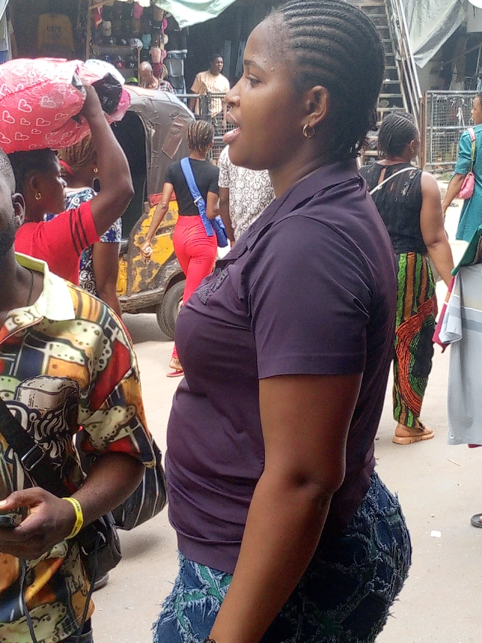 An outdoor scene depicts a crowded street or marketplace. In the foreground, an adult Black female is viewed in profile, facing left, with her mouth slightly open and tongue visible. She wears a dark purple collared short-sleeved shirt and blue distressed denim shorts or skirt. Her hair is styled in cornrows, and she has small gold hoop earrings. To her immediate left, an adult Black male's torso and arm are visible, wearing a colorful patterned shirt and a black cross-body bag; he holds a dark object in his left hand, and a yellow wristband is present on his wrist. In the midground, an adult Black female walks away, carrying a pink patterned bundle on her head, wearing a red short-sleeved top. Behind her, a yellow three-wheeled motorized vehicle is partially visible. Further back, another adult Black female walks away, wearing a black top, tight red pants, and a blue shoulder bag. To her right, another adult Black female walks away in a black sleeveless top and vertically striped pants (green, orange, black). The background features market stalls with various goods, including hats, displayed under a green tarp awning. An older adult Black male is visible behind a stall. A metallic staircase or railing is present on the upper right. The ground appears to be uneven dirt or pavement. The scene is illuminated by natural daylight.