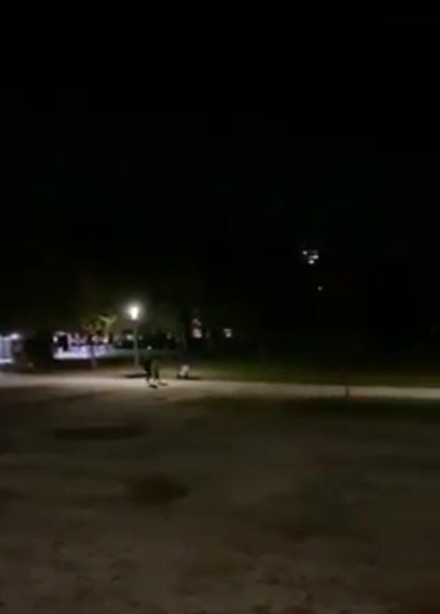 A static shot shows a dimly lit park at night. Several streetlights illuminate a pathway and small buildings in the distance. A person is visible walking along the path under one of the streetlights, and there are other figures further away. The foreground is a sandy or gravelly area, and trees are visible in the background. The overall impression is of a quiet, urban park at night.