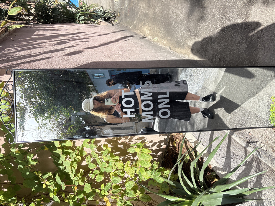 A reflective mirror stands vertically amidst plants and a concrete landscape. The reflection captures a person wearing a hat, a tank top with "HOT MOMS ONLY" printed on it, and shorts. They hold a phone, presumably taking a selfie. Another person, dressed in black, is faintly visible in the background of the reflection. Shadows of the plants and surrounding environment cast across the mirror's surface, creating a fragmented and layered visual.