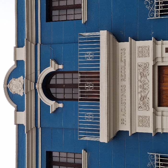 A blue building has decorative architectural elements in white and gray. Several windows are visible. The second window features a balcony with decorative metalwork. A vertical plaque reads "PP. AGUSTINOS RECOLETOS" in embossed letters. Decorative floral carvings are present on the building's façade next to a brown wooden door. The building exhibits a blend of classical and ornate design features.