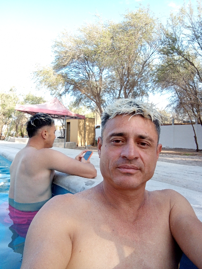 Two shirtless men are at a pool. One man is facing the camera with graying hair bleached blonde on top. He has wet skin, suggesting he's been in the water. Beside him is another man in the pool, turned away. He is holding a phone and leaning against the pool's edge. Behind them, there's a simple structure with a red canopy and an adjacent building. Trees fill the background beneath a bright sky.