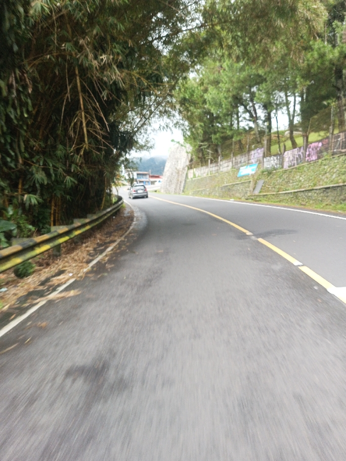 The image depicts a paved asphalt road curving to the left, likely in Bangtsho, Bhutan. The road surface appears damp, exhibiting motion blur, indicating a moving camera perspective. A solid yellow line delineates the center, and a solid white line marks the right edge of the visible roadway. On the left side of the road, dense bamboo and other green foliage form a thick barrier, with a weathered yellow and black guardrail visible below. Dried leaves and debris accumulate between the guardrail and the road's edge. On the right, an uphill embankment features a stone retaining wall, partially covered in moss or small vegetation, with sections displaying multi-colored graffiti. Above the retaining wall, coniferous trees and grassy slopes are visible. In the distance, a dark-colored sedan travels away from the viewer, navigating the left curve. Further beyond the car, several buildings and distant mountains are discernible under an overcast sky. No individuals are present in the scene.