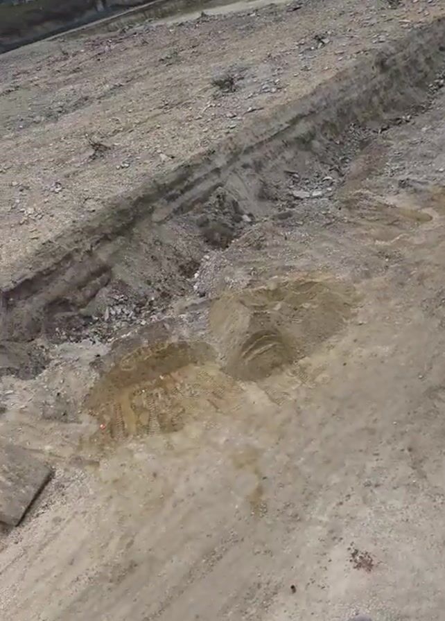 n aerial view of a construction site. The ground is mostly dirt, rock, and debris. There is a large trench that appears to be newly dug. In the foreground are a few pieces of broken concrete and a small concrete cylinder. Some buildings can be seen in the background. The video is taken from a high vantage point, possibly a rooftop. The weather appears overcast.