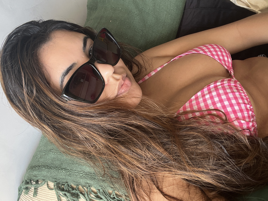 A medium close-up shot features an individual, likely female, with long, dark brown hair exhibiting lighter highlights. The subject wears large, black-framed sunglasses, obscuring the eyes, and a pink and white gingham pattern bikini top. The visible portion of the face includes full, lightly colored lips. The subject is positioned against soft furnishings, which include a light beige cushion with green fringed details on the left, and a solid dark green cushion on the right, partially obscuring a dark grey fabric. The environment suggests an indoor or sheltered outdoor setting. The specific location within Recife, Brazil, cannot be identified from the visual information presented.