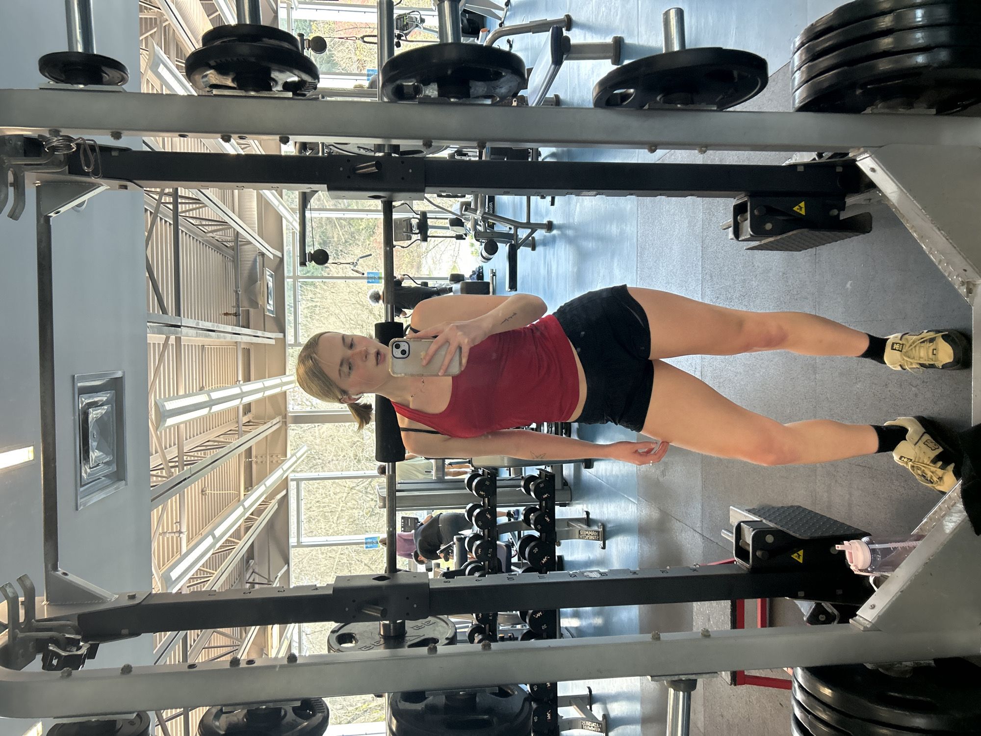 A young woman wearing a red tank top and black shorts is taking a selfie in front of a mirror in a gym