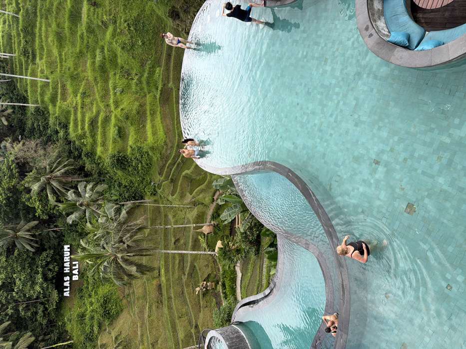 An aerial view depicts an infinity pool complex with turquoise water, nestled beside verdant rice terraces and palm trees. Several people are scattered throughout the pool, some wading and others seemingly enjoying the panoramic vista. A circular lounge area with blue cushions sits adjacent to the pool. A sign reading "ALAS HARUM BALI" is visible among the trees. The overall composition suggests a luxurious resort experience with a blend of nature and leisure.