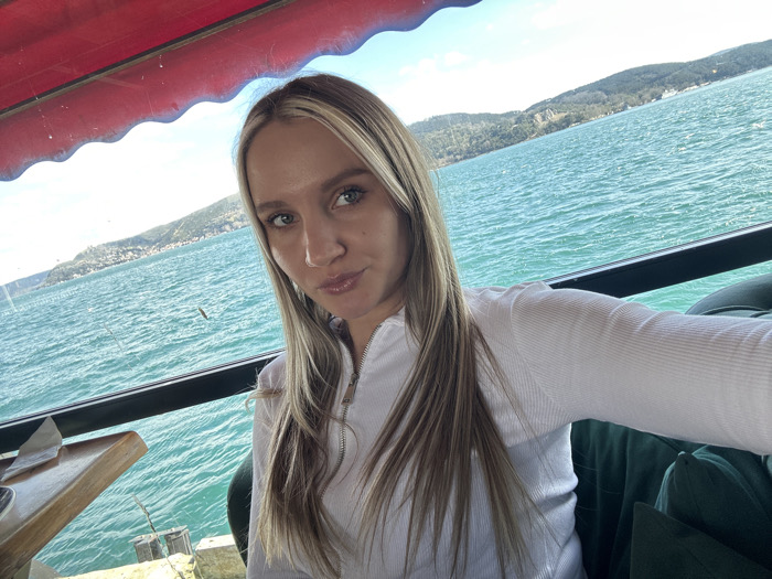 A single female subject, appearing to be an adult, is depicted in a selfie, positioned frontally and looking directly into the camera. She has long, straight, blonde-highlighted hair and light-colored eyes, with a neutral facial expression featuring slightly pursed lips. She wears a white, ribbed, long-sleeved top with a partial zipper closure. Behind her right shoulder, a segment of a green upholstered seat is visible. The scene is set indoors, likely within a cafe or restaurant, offering a view over a body of water. A red, scalloped awning is visible at the top of the frame. To the subject's left, a light-colored wooden table holds a folded white napkin and a dark, cylindrical item. Below a dark-framed window, a concrete or stone structure featuring dark, possibly metallic, elements is present. Beyond the window, an expansive body of turquoise water, consistent with the Bosphorus Strait in Beykoz, Turkey, exhibits discernible surface ripples. On the distant horizon, a landmass comprising several hills covered with dense green vegetation is visible beneath a light blue sky with scattered clouds. The scene is illuminated by natural daylight.
