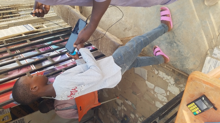 This image depicts an outdoor or semi-outdoor scene situated in Masaka, Nigeria. The primary subject is a young male, appearing to be a child or adolescent, standing in a partial profile facing right. He has short, dark hair and wears a light grey long-sleeved shirt with partially visible red lettering on the upper back, blue jeans, and pink open-toed slides. His hands are actively engaged with a small, light blue handheld device. A second individual, whose right arm and left hand are visible on the right side of the frame, holds a dark-colored smartphone directly in front of the young male. A black cable extends from this smartphone to an earbud or small audio device held in the second individual's left hand. This setup suggests an interactive activity, possibly gaming or a mediated communication, where the young male is using the blue device to control or interact with content on the smartphone. In the upper left background, a third individual is partially visible, seated on an orange plastic chair, wearing a light-colored top. The immediate background consists of vertical dark metal bars, behind which colorful posters or advertisements are displayed on a wall. The ground in the foreground is covered with light-colored, possibly patterned, tiles, transitioning to a rougher concrete surface towards the right. In the lower left foreground, a black POS terminal with yellow and green buttons and a small screen rests on a light brown wooden stool or table.