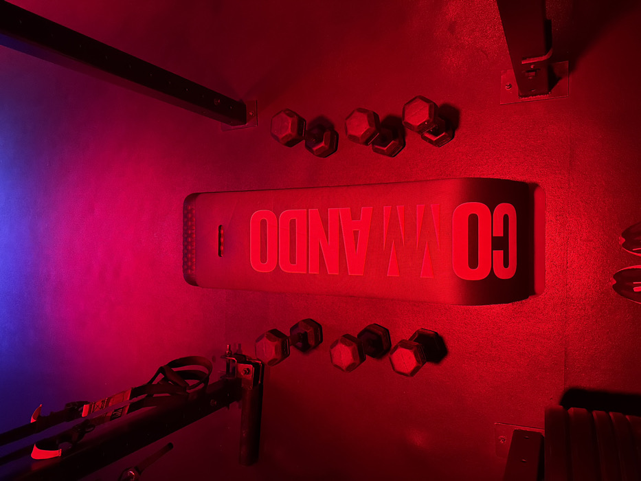 An indoor fitness studio, specifically a "Commando Studio" in Mexico City, is illuminated primarily by red light, with a gradient transition to purple and blue light visible in the upper background