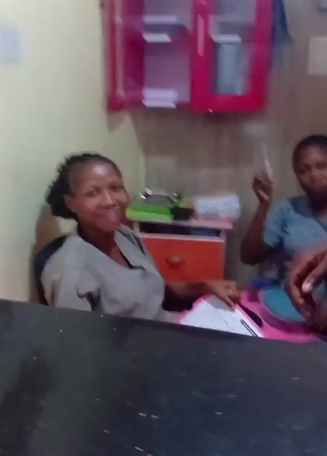 four women in what appears to be a medical or dental office. They are behind a counter, smiling and looking at the camera. The room has a red cabinet on the wall, a clock, and some medical supplies on the counter. The women appear to be happy. Someone is recording the video. Baby sounds are heard in the background.