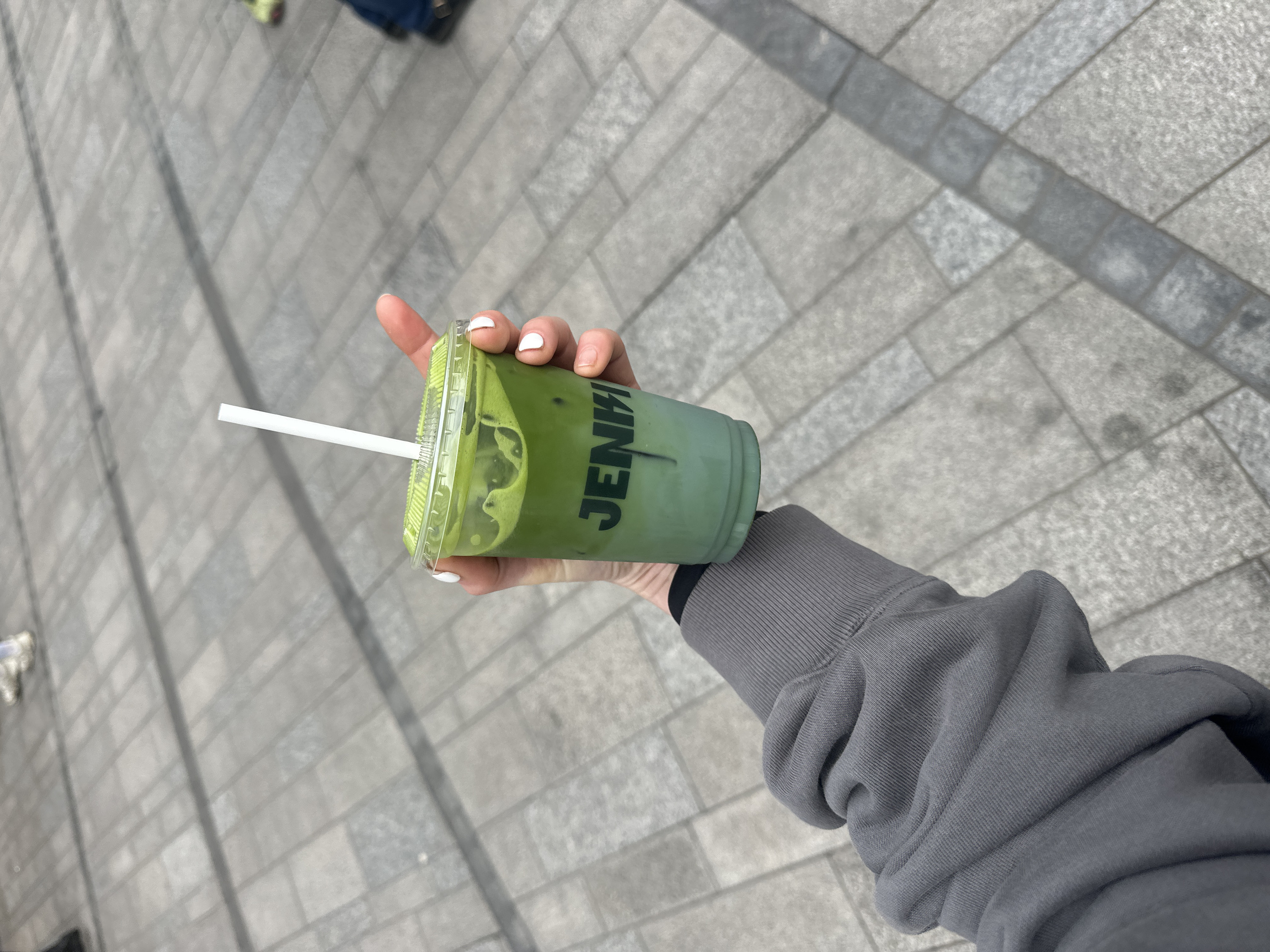 A right hand, adorned with white nail polish, holds a clear plastic cup containing a green layered beverage