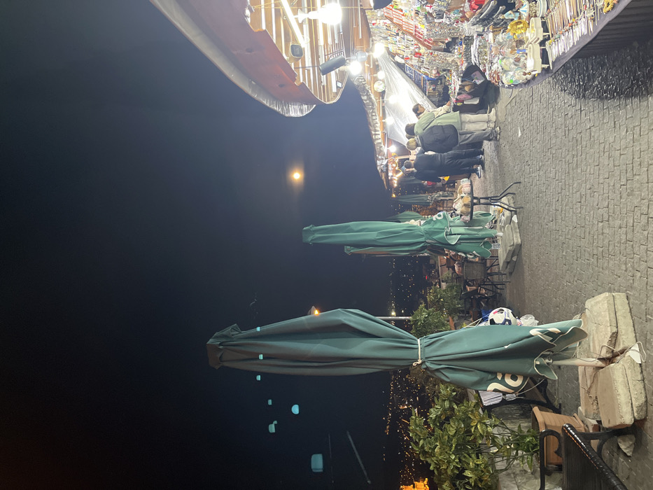 The image depicts a nighttime scene from an elevated outdoor promenade in Tbilisi, Georgia, specifically overlooking the city, consistent with the area near Narikala Fortress. The dark sky features a prominent, bright moon. Below the horizon, the sprawling cityscape of Tbilisi is visible, illuminated by a multitude of distant lights. In the foreground and midground, a paved area with dark cobblestones is present. Several tall, green market umbrellas are folded and secured with rope, anchored by cracked concrete blocks at their bases. Potted plants, dark outdoor tables, and chairs are positioned nearby. On the right side of the frame, a brightly lit outdoor market stall is active. It features a distinctive curved, possibly wooden, overhead structure and is illuminated by numerous string lights and overhead fixtures. The stall displays a wide variety of merchandise, including small ornamental items, glassware, and other souvenirs. Several individuals, dressed in casual clothing, are observed standing and browsing the items at the market stall. No specific interactions between individuals are clearly discernible.
