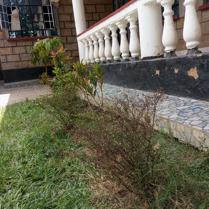 The image depicts the exterior of a residential or commercial building in Mahiakalo ward, Kenya, during daylight hours. No individuals are present. **Scene Description:** The foreground features a strip of green grass, mixed with some drier patches of earth. Immediately behind the grass, a row of three distinct bushes is visible. The leftmost bush is a small, vibrant green plant. The central bush is taller with green and yellow variegated leaves. The rightmost bush appears withered or dry, with brown, sparse foliage and visible branches. Behind the bushes, a low, tiled retaining wall or foundation, approximately 30-40 cm high, runs horizontally across the frame. This wall is dark gray/black at its base, with a light gray and blue patterned tile covering its upper section. The tiles exhibit a semi-circular or scalloped pattern. Above this wall, a white balustrade-style railing extends across the middle ground. The railing consists of multiple white balusters with a decorative profile, supporting a top rail that has a reddish-brown edge. The balustrade appears to be part of a porch or balcony structure. Some flaking paint and weathering are visible on the balusters and the dark gray section below them. In the background, behind the railing, a building constructed of light brown brick is visible. A large window with multiple panes, some open, is present on the building's facade. The window frames are dark, likely black or dark brown. Reflected light and foliage can be seen in the window glass. To the left of the window, a small tree with light green leaves is planted. A white support pillar is visible to the right of the window, partially obscured by the balustrade. The ground beneath the window and to the left of the building appears to be a light-colored paved or tiled surface.