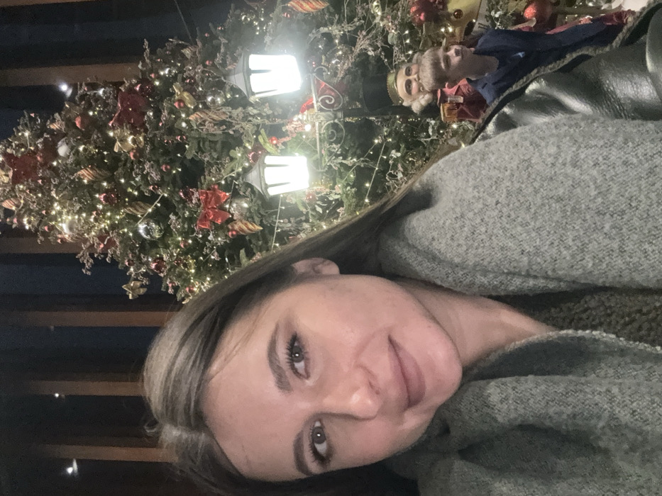 A frontal image shows a young adult female in the left and central foreground, likely capturing a selfie. She has long, dark brown hair, a fair complexion, and a subtle smile, looking directly into the camera. She is clad in a grey, textured scarf or wrap. The background features a large, densely decorated Christmas tree, illuminated with warm white string lights, red bows, silver and red spherical ornaments, and candy cane decorations. Two antique-style street lamps, emitting bright white light, are positioned in the mid-ground in front of the tree. To the right, partially visible, is a young boy with light brown hair, dressed in a dark blue jacket, looking towards the right. Behind him is the upper portion of a large Nutcracker soldier figure. The scene is festive, suggestive of an indoor or covered outdoor holiday display in Barvikha, Russia.