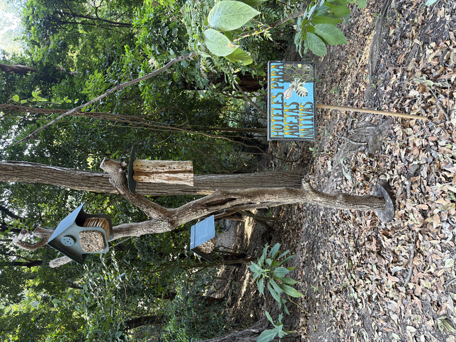 A tree in a wooded area has several bee houses attached to its trunk and branches. One is a blue house with multiple tubes, another is a hollow log section, and a third is a blue square box. A sign reads "Hoteles Para Abejas Nativas" (Hotels for Native Bees) and features an illustration of a bee. The ground around the tree is covered in fallen leaves and the surrounding trees provide a dense canopy.