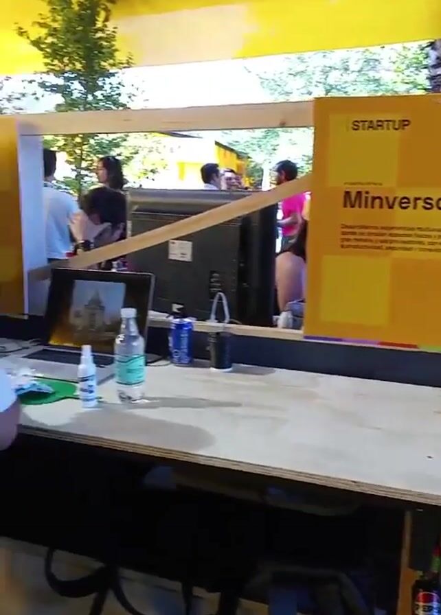 startup booth at an outdoor event. The booth has a yellow sign with the word "Minverso" and "Startup EttMday" on it. Several people are sitting and standing around a wooden table with laptops, monitors, and VR headsets. One person wears a "The Godfather" t-shirt. Another person walks by wearing sunglasses and a lanyard. The booth is under a tent, and outside the tent, there's grass and trees.