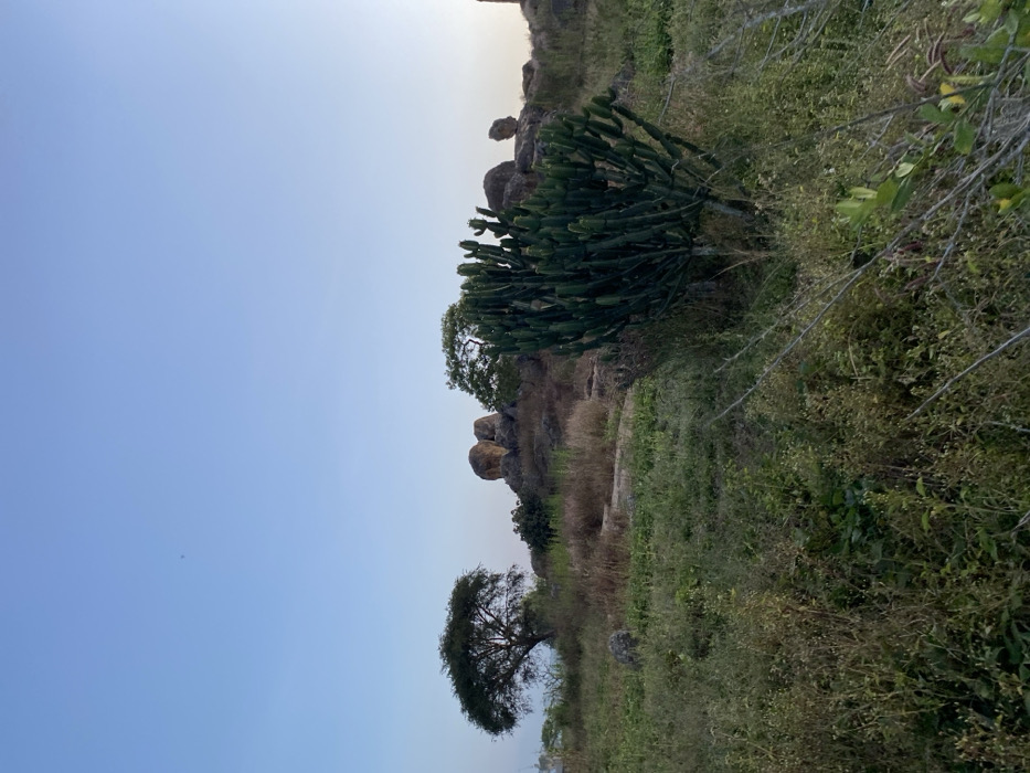 The scene depicts a natural, rocky landscape in Bukuru, Nigeria, under a clear, pale blue sky. The foreground features sparse, mixed vegetation consisting of dry grasses and various low-lying green plants covering uneven ground. In the midground, the terrain rises, revealing several large, smooth, rounded boulders scattered across the rocky hill. A prominent, multi-stemmed, dark green succulent plant, resembling a euphorbia or cactus, stands on the right side of the midground. To its left, a mature tree with a dense, rounded green canopy is visible. Further left and slightly behind, another smaller tree with dark foliage is present. The horizon is low, with more indistinct rocky formations and sparse vegetation visible in the distant background. No people, animals, or man-made structures are discernible within the frame. The lighting suggests either early morning or late afternoon conditions, with a soft, even illumination across the landscape.